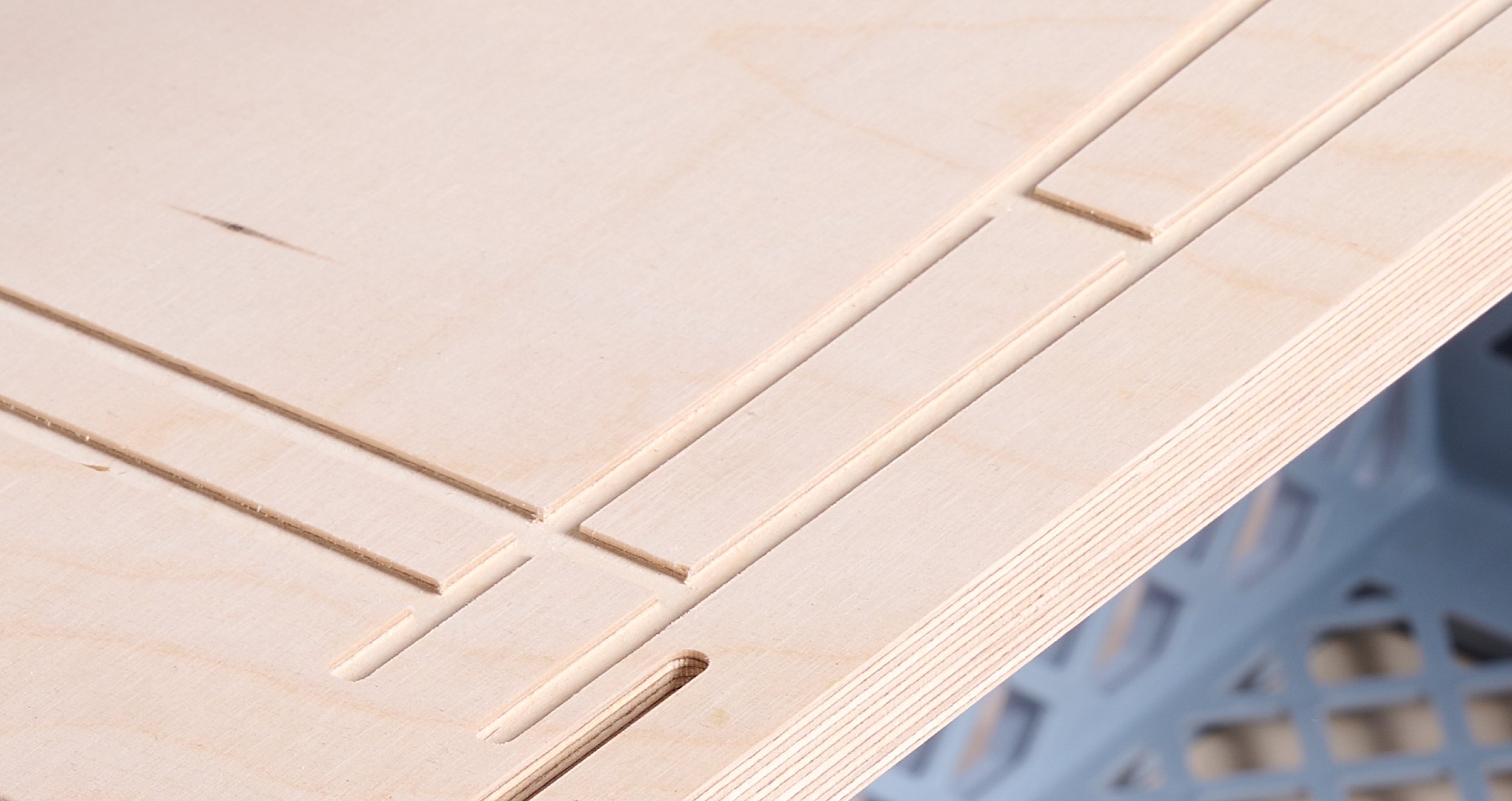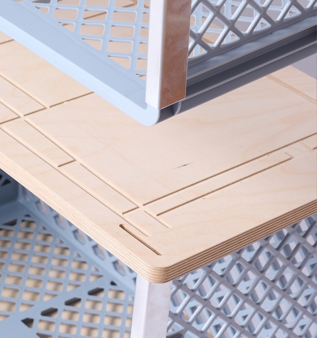 18 Millimeter starke Holzplatten bilden die Basis des Sideboards. Sie bestehen wahlweise aus naturbelassenem Multiplex oder dunklem Siebdruck. In diese werden mittels präziser CNC-Technik die Konturen der Euro-Boxen gefräst, so dass ein Verrutschen der Kisten unmöglich gemacht wird. Die Bodenplatte ist mit weichen Industrierollen versehen, die ein belagschonendes Bewegen des FAF gewährleisten.
