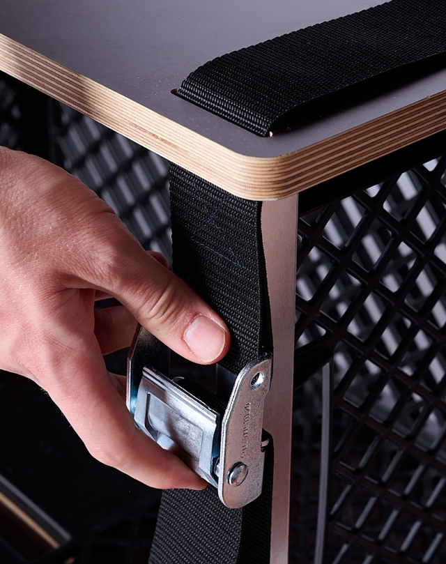 Drei Komponenten werden zu einer Einheit: Euro-Boxen, Holzplatten und Spanngurte werden in wenigen Minuten und ohne Werkzeug so zusammengesetzt, dass ein stabiles Sideboard entsteht.